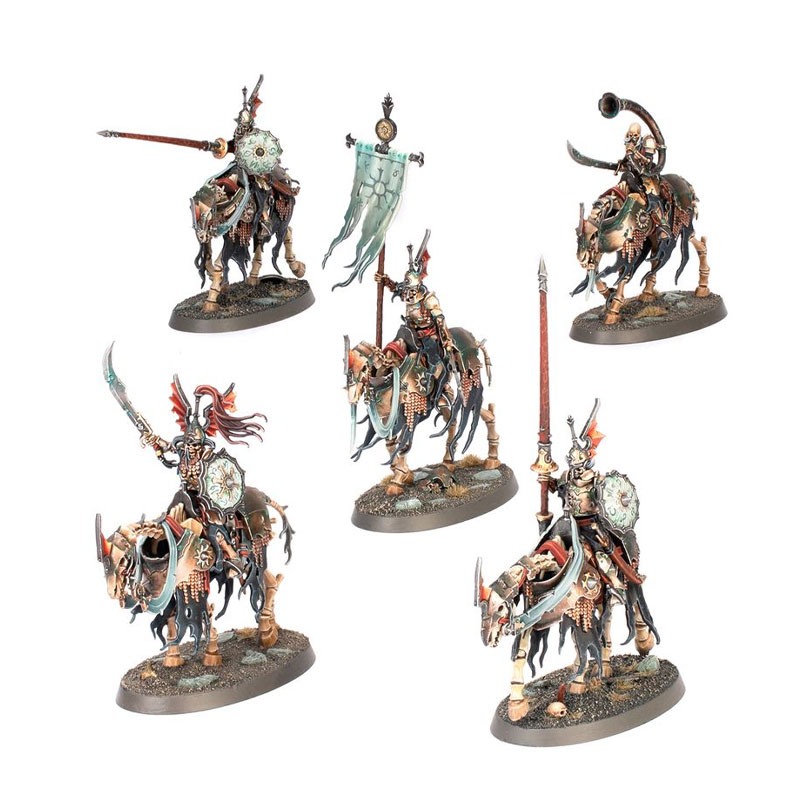 This multipart plastic kit builds five Barrow Knights, a Deathrattle cavalry unit for your Soulblight Gravelords armies in games of Warhammer Age of Sigmar. Mounted on skeletal steeds, they are armed with lances and equipped with shields. These fast, flexible warriors are excellent harassment units, or line-breakers in larger numbers.